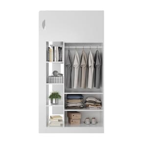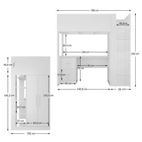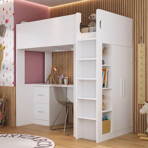 A Cama Alta com Armário, Nichos e Escritório Foscarini oferece uma solução completa para o quarto do seu filho, incluindo cama com proteção lateral, mesa de escritório 2 gavetas com corrediças telescópicas e armário 2 portas com puxadores de alumínio, dobradiças com amortecedores, 1 cabide de metal e 2 prateleiras internas, além de 4 nichos abertos.