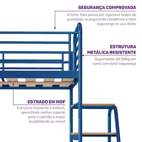 pessoas com conforto e estilo. Seja para um quarto compacto ou para quem busca mais funcionalidade no dia a dia, a cama alta Teko é a escolha perfeita para transformar o ambiente com inteligência e personalidade. Acabamento dos Pés: Pintura Acompanha Cama Auxiliar: Não Acompanha Colchão: Não Acompanha Dossel: Não Acompanha Móbile: Não Acompanha Suporte para Mosquiteiro: Não Altura do Estrado até o Chão: 144 cm Altura dos Pés: 144 cm Ambiente Principal: Quarto Infantil codigo_ean: 7900288145802 Complexidade da Montagem: Alta: deve ser montado por um montador especializado Cor: Azul / Álamo Cor do Produto: Azul / Álamo Escala de Brilho: Semi-Fosco Extensível: Não Itens Inclusos: 1 cama alta, 1 kit ferragens e 1 manual de montagem Linha ou Coleção: Linha Teko Manual de Montagem e Instalação: https://cdn2.madeiramadeira.com.br/prd/sedlak-representacao/2918254-168-9235a300-b87a-4079-acaa-e5aee549ba20-1747050977.pdf Marca: Casatema Material da Escada: Aço/MDF Material do Estrado: MDF Material dos Pés: Aço Material Principal: Aço Necessita Montagem: Sim Origem do Produto: Nacional Permite a Utilização de Cama Auxiliar: Sim Peso: 78 kg Peso Suportado por cada cama: 80 kg Possui Baú: Não Possui Gavetas: Não Possui Grade: Sim Possui Pés: 04 Possui Portas: Não Possui Prateleiras: Não Possui Rodízio: Não Recomendações de Uso, Manutenção e Limpeza: Use um pano macio, levemente umedecido com água. Não utilize solventes ou abrasivos.Para garantir estabilidade e durabilidade, é recomendado reapertar os parafusos de tempos em tempos. Sapatas Niveladoras: Não Sistema de Montagem: Parafusos Tamanho do Colchão Indicado (L x C): 88x188cm Tipo de Cama: Infantil Tipo de Colchão: Solteiro Tipo de Estrado: Fixo