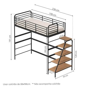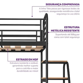 para transformar o ambiente com inteligência e personalidade. Acabamento dos Pés: Pintura Acompanha Cama Auxiliar: Não Acompanha Colchão: Não Acompanha Dossel: Não Acompanha Móbile: Não Acompanha Suporte para Mosquiteiro: Não Altura do Estrado até o Chão: 144 cm Altura dos Pés: 144 cm Ambiente Principal: Quarto Infantil codigo_ean: 7900288145826 Complexidade da Montagem: Alta: deve ser montado por um montador especializado Cor: Preto Fosco / Álamo Cor do Produto: Preto Fosco / Álamo Escala de Brilho: Semi-Fosco Extensível: Não Itens Inclusos: 1 cama alta, 1 kit ferragens e 1 manual de montagem Linha ou Coleção: Linha Teko Manual de Montagem e Instalação: https://cdn2.madeiramadeira.com.br/prd/sedlak-representacao/2918237-168-9235a300-b87a-4079-acaa-e5aee549ba20-1747050976.pdf Marca: Casatema Material da Escada: Aço/MDF Material do Estrado: MDF Material dos Pés: Aço Material Principal: Aço Necessita Montagem: Sim Origem do Produto: Nacional Permite a Utilização de Cama Auxiliar: Sim Peso: 78 kg Peso Suportado por cada cama: 80 kg Possui Baú: Não Possui Escrivaninha: Não Possui Gavetas: Não Possui Grade: Sim Possui Pés: 04 Possui Portas: Não Possui Prateleiras: Não Possui Rodízio: Não Recomendações de Uso, Manutenção e Limpeza: Use um pano macio, levemente umedecido com água. Não utilize solventes ou abrasivos.Para garantir estabilidade e durabilidade, é recomendado reapertar os parafusos de tempos em tempos. Sapatas Niveladoras: Não Sistema de Montagem: Parafusos Tamanho do Colchão Indicado (L x C): 88x188cm Tipo de Cama: Infantil Tipo de Colchão: Solteiro Tipo de Estrado: Fixo