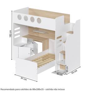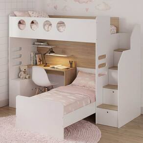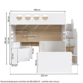 Informações Complementares: Cama alta suporta 120kg, Cama de solteiro 100kg, prateleiras móveis 5kg, prateleiras fixas 10kg, tampo da escrivaninha 20kg. Produto não é personalizavel, ou seja, todas as peças enviadas devem ser montadas para não comprometer a estrutura do móvel. Altu
