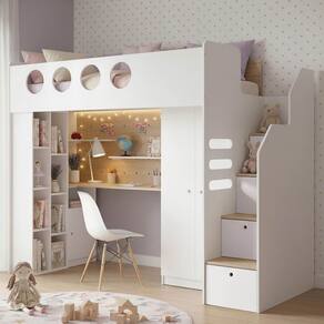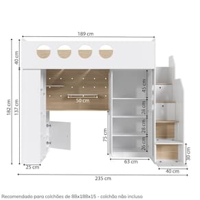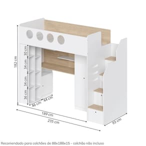 Informações Complementares: Cama alta suporta 120kg, Nichos verticais 5kg cada, prateleiras móveis 5kg, prateleiras fixas 10kg, tampo da escrivaninha 20kg. Produto não é personalizavel, ou seja, todas as peças enviadas devem ser montadas para não comprometer a estrutura do móvel.