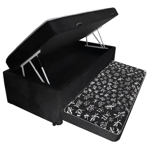 Estrutura Interna: Estrutura em madeira 100% de Reflorestamento Tecido: Suede Cor: Preto Necessita Montagem: Não Ambiente: Quarto Altura: 50 cm Largura: 88 cm Profundidade: 188 cm Possui Pés: Sim Altura dos Pés: 6 cm Altura Interna: 23 cm Baú: Pistão a Gás Contém 02 puxadores, para maior facilidade na abertura Contém 01 arco na parte de trás para o colchão não escorregar Durabilidade: Fabricado com materiais de alta qualidade, garantindo resistência e longevidade.Suporta até 90 kg: O box oferece o suporte necessário para um descanso completo. (Espuma suporta 60KG)Características da Espuma: Tamanho: Solteiro (188x88x5cm) – ideal para espaços compactos, sem perder o conforto. Densidade D23: Firmeza e adaptabilidade para um sono confortável e saudável. Suporta até 60 kg: O colchão oferece o suporte necessário para um descanso completo.