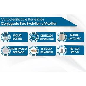Suporte de Peso da Bicama Box - 120 Kg Suporte de Peso da Cama Auxiliar Box - 100 Kg Tipo de Conforto da Cama Auxiliar Box - Firme Características Internas da Bicama Box - Estrutura de Madeira