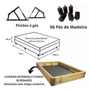 CAMA BOX BAÚ SOLTEIRO REFORÇADA - EXCLUSIVE (sem colchão) Largura: 0,88 Comprimento: 1,88 Profundidade: 30cm (parte interna do Baú) = ALTURA (sem pezinhos) = 42cm // ALTURA TOTAL (com pezinhos) = 48cm aprox. Acompanha: 02 PISTÕES A GÁS - amortecedores pneumáticos que possibilitam a fácil abertura do baú, o mantendo aberto enquanto utilizado. 02 puxadores utilizados para facilitar a abertura e o fechamento do box baú. Cantoneiras 06 pezinhos de madeira com 6cm de altura cada aprox.