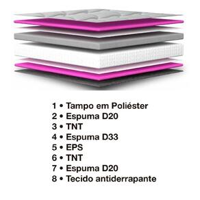 REVESTIMENTO INTERIOR: Tampo em tecido Jacquard, Espuma Macia D20, TNT, Espuma D45, EPS, TNT, Espuma D20, Tecido antiderrapante