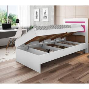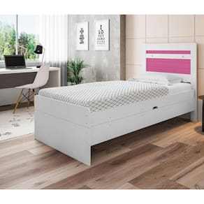 Cama Baú Solteiro Larissa Branco e Rosa com Colchão