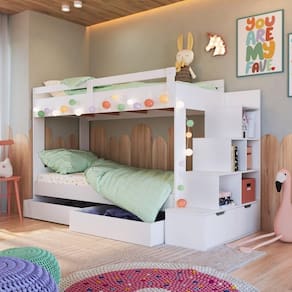 A Cama Beliche Infantil Bicama para Menino e Menina 2,32m com Escada, Nichos e Gavetas com Rodas da Completa Móveis transforma o quarto da criança em um espaço encantador, com escadas laterais que oferecem praticidade na subida e descida dos pequenos, a cama beliche é perfeita para otimizar o espaço. Cada degrau possui nichos integrados, proporcionando solução inteligente para guardar e organizar brinquedos, livros e outros acessórios. Além disso, os dois últimos são acompanhados por gavetas, tornando o produto ainda mais completo. A Cama Beliche da Completa Móveis oferece a flexibilidade de montar a escada lateral tanto do lado direito quanto do lado esquerdo, adaptando-se às necessidades do ambiente.