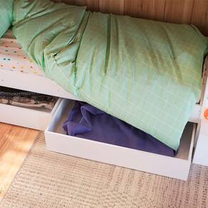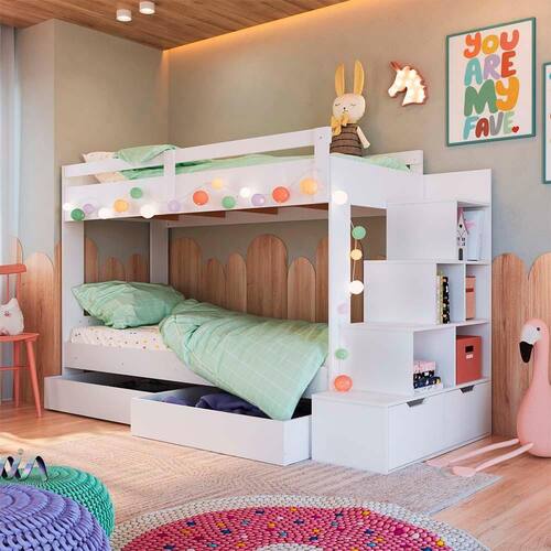 O quarto da sua ou suas crianças ficará ainda mais charmoso com a nossa Cama Beliche. Com escadas laterais, uma praticidade para a subida e descida do seu pequeno. Em cada degrau, nichos que facilitam e otimizam o espaço. Nestes nichos, podes guardar e organizar vários brinquedos, livros e outros acessórios. Nos últimos dois nichos rentes ao chão, duas gavetas que acompanham o produto e o tornam ainda mais completo! Permite a montagem da escada lateral tanto do lado direito quanto lado esquerdo. Para completar e sofisticar ainda mais o produto, acompanha dois gavetões inferiores, podendo assim armazenar o restante das coisas do quarto, sejam roupas de cama, outros brinquedos, etc.