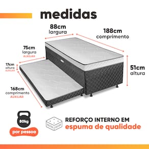 MEDIDA TOTAL DO PRODUTO: [ A ] = 51 cm / 44 cm ( Sem Pés ) [ L ] = 88 cm [ P ] = 188 cm MEDIDA DA CAMA AUXILIAR: [ A ] = 17 cm / 10 cm ( Sem Pés ) [ L ] = 75 cm [ P ] = 168 cm MEDIDA INTERNA DO BAÚ: [ A ] = 15 cm [ L ] = 74 cm [ P ] = 174 cm ALTURA DOS PÉS: 7 cm PESO: 53,8 Kg PESO SUPORTADO: 80Kg MODELO: Cama Bibox com Baú Solteiro Ortopédica com Cama Auxiliar Conjugada 88x188x51cm Gabi MARCA: Somopar REVESTIMENTO SUPERIOR E LATERAL: Acabamento em tecido poliéster de alta qualidade, com bordado nas laterais que adiciona um toque de sofisticação e elegância ao design. REVESTIMENTO INTERNO: Camada de espuma D28 dentro dos padrões ABNT, de alta qualidade, com suporte ortopédico que garante firmeza e conforto na medida certa, suportando até 80 kg por pessoa. EURO PILLOW: Sim, acabamento sofisticado que traz um toque extra de maciez, elegância e conforto premium para suas noites de sono. MATERIAL DA ESTRUTURA: Produzida em madeira de eucalipto de alta resistência, garantindo durabilidade, firmeza e suporte seguro por muito mais tempo. MATERIAL DO PISTÃO: Molas MATERIAL DOS PÉS: PVC QUANTIDADE DE PÉS: 8 DIFERENCIAL: 4 em 1 ITENS INCLUSO: 1 Cama box baú conjugada Solteiro com 1 Cama auxiliar Solteiro GARANTIA: 3 Meses Pelo Fabricante