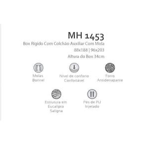 CARACTERÍSTICAS GERAIS DA BICAMA BOX Suporte de Peso da Cama Box - 150 Suporte de Peso da Cama Auxiliar Box - 100 Tipo de Conforto da Cama Auxiliar Box - Firme c/ Toque de Maciez
