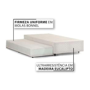 CARACTERÍSTICAS INTERNAS DA BICAMA BOX Características Internas da Bicama Box - Estrutura de Madeira Características Internas da Cama Auxiliar - Estrutura de Madeira Estofamento Interno da Cama Auxiliar - 28 Tipo da Estrutura de Molas da Cama Auxiliar - Bonnel Outras Características Internas da Cama Auxiliar - Manta Acrílica - Espuma sem CFC