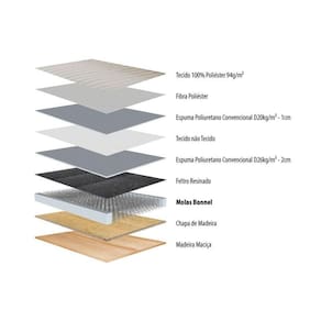 CAMA BOX (CARACTERÍSTICAS) Características Gerais - Não acompanha Cantoneira Sobre os Pés para Cama Box - Pés foto ilustrativa - Pés Fixos ABS/PVC Altura da Cama Box com os pés - 34 Características Gerais da Cama Auxiliar - Pés Fixos de PVC Características Internas da Cama Auxiliar - Estrutura de Madeira Estofamento Interno da Cama Auxiliar - 28 Tipo da Estrutura de Molas da Cama Auxiliar - Bonnel Altura da Cama Auxiliar com os pés - 18 Outras Características Internas da Cama Auxiliar - Espuma sem CFC - Manta Acrílica