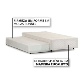 BICAMA BOX (CARACTERÍSTICAS) Sobre a Bicama Box - Bicama Box com Auxiliar - Vantagens da Bicama Box - Cuidados com a Bicama Box - Bicama Box com Auxiliar de Molas Suporte de Peso da Bicama Box - 150 Kg Suporte de Peso da Cama Auxiliar Box - 100 Kg Tipo de Conforto da Cama Auxiliar Box - Firme c/ Toque de Maciez Características Internas da Bicama Box - Estrutura de Madeira