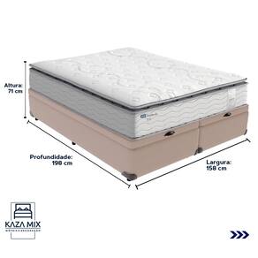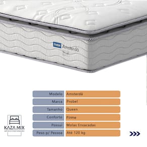 O conforto que sua casa precisa e a qualidade que você merece está na Kazamix!Colchão Probel Amsterdã – a escolha perfeita para noites de sono inigualáveis. Equipado com Molas Ensacadas Prolastic, oferece suporte individualizado, reduzindo a transferência de movimentos para um descanso mais tranquilo. Seu Pillow Top Super proporciona uma camada extra de maciez, elevando o conforto e garantindo uma experiência de luxo.Com camadas de espuma D33 e D65, o Amsterdã combina firmeza e durabilidade, enquanto as proteções antiácaro, antialérgico e antifungo criam um ambiente de sono saudável.Invista em qualidade e bem-estar com o Colchão Probel Amsterdã e transforme suas noites.Modelo: AmsterdãMarca: ProbelTamanho: QueenDimensões: 158x198X34 (Largura x Comprimento x Altura)Conforto: FirmeSistema: Molas EnsacadasPillow: Pillow TopPeso Máximo recomendado: 120 kg (Por pessoa)Proteções: Antiácaro, antialérgico, antifungo, antimofoGarantia: 1 ano pelo FabricanteO conforto que sua casa precisa e a qualidade que você merece está na KazamixAproveite cada metro quadrado do seu dormitório com a Cama Box Baú!Projetada com madeira de reflorestamento reforçada, a Cama Box Baú é a escolha ideal para quem busca otimização de espaço e praticidade na organização do dia a dia.Com um baú generoso, ela oferece a solução perfeita para armazenar travesseiros extras, cobertores, malas e muito mais. Além disso, sua estrutura robusta suporta até 150 kg por pessoa, garantindo a sustentação ideal para o seu colchão e prolongando sua vida útil.O pistão a gás robusto proporciona uma abertura suave e segura do baú, oferecendo praticidade e resistência no uso diário. Para completar, o acabamento de alta qualidade combina perfeitamente com qualquer estilo de decoração, agregando elegância e versatilidade ao seu ambiente.Não perca tempo! Adquira agora mesmo sua Cama Box Baú e diga adeus à falta de espaço e desorganização.Marca: KazaMixModelo: BaúCor do Box: BegeTamanho: QueenDimensões: 158X198X37 (Largura x Comprimento x Altura) Estrutura: MadeiraPeso máximo recomendado: 150 kg (Por Pessoa)Altura do Box: 32 cm Altura dos Pés: 5 cm Altura total: 37 cm Garantia: 03 mesesSelo Ecologicamente CorretoAtenção: Antes de finalizar sua compra, certifique-se de que as dimensões do produto sejam adequadas para serem transportadas pelos elevadores, portas, escadas e corredores de sua residência. Ressaltamos que não nos responsabilizamos pelo transporte do produto por meios específicos, como escadas, guinchos ou içamentos.