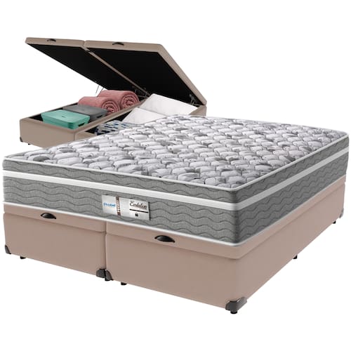O conforto que sua casa precisa e a qualidade que você merece está na Kazamix!O Colchão Evolution é a escolha ideal para quem busca conforto, suporte e qualidade em cada noite de sono. Com Molas Ensacadas que oferecem um suporte individualizado, e um Pillow Euro que proporciona uma camada extra de suavidade, esse colchão transforma seu descanso em uma experiência de luxo.Com espuma D28 de alta densidade, o Evolution garante firmeza e conforto duradouros. Seu acabamento em poliéster diamante e bordado em matelassê trazem um toque de elegância e sofisticação ao seu ambiente.Além disso, o colchão é tratado com propriedades antiácaro e antialérgico, garantindo um sono mais saudável e seguro.Invista no seu bem-estar com o colchão Evolution, e experimente a combinação perfeita de conforto e durabilidade!Modelo: EvolutionMarca: ProbelTamanho: QueenDimensões: 158x198X32 (Largura x Comprimento x Altura)Conforto: IntermediárioSistema: Molas EnsacadasPillow: Euro PillowPeso Máximo recomendado: 110 kg (Por pessoa)Proteções: Antiácaro, antialérgico, antifungo, antimofoGarantia: 1 ano pelo FabricanteO conforto que sua casa precisa e a qualidade que você merece está na KazamixAproveite cada metro quadrado do seu dormitório com a Cama Box Baú!Projetada com madeira de reflorestamento reforçada, a Cama Box Baú é a escolha ideal para quem busca otimização de espaço e praticidade na organização do dia a dia.Com um baú generoso, ela oferece a solução perfeita para armazenar travesseiros extras, cobertores, malas e muito mais. Além disso, sua estrutura robusta suporta até 150 kg por pessoa, garantindo a sustentação ideal para o seu colchão e prolongando sua vida útil.O pistão a gás robusto proporciona uma abertura suave e segura do baú, oferecendo praticidade e resistência no uso diário. Para completar, o acabamento de alta qualidade combina perfeitamente com qualquer estilo de decoração, agregando elegância e versatilidade ao seu ambiente.Não perca tempo! Adquira agora mesmo sua Cama Box Baú e diga adeus à falta de espaço e desorganização.Marca: KazaMixModelo: BaúCor do Box: BegeTamanho: QueenDimensões: 158X198X37 (Largura x Comprimento x Altura) Estrutura: MadeiraPeso máximo recomendado: 150 kg (Por Pessoa)Altura do Box: 32 cm Altura dos Pés: 5 cm Altura total: 37 cm Garantia: 03 mesesSelo Ecologicamente CorretoAtenção: Antes de finalizar sua compra, certifique-se de que as dimensões do produto sejam adequadas para serem transportadas pelos elevadores, portas, escadas e corredores de sua residência. Ressaltamos que não nos responsabilizamos pelo transporte do produto por meios específicos, como escadas, guinchos ou içamentos.