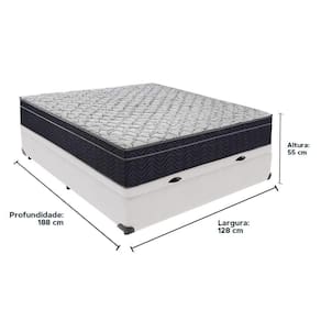 Base Box com Baú: Marca: KazaMix; Cor do Baú: Branco; Revestimento da Cama: Material Sintético; Material dos pés: Madeira; Estrutura: Madeira; Abertura: Pistão a gás; Peso máximo recomendado: até 150kg de cada lado; Altura do Baú: 32cm; Altura dos pés: 5cm; Altura total: 37cm; Garantia: 03 meses; Selo Ecologicamente Correto.