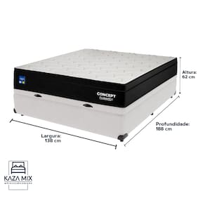 Bem-vindo(a) ao nosso catálogo!Apresentamos a você uma descrição completa sobre esse produto:Fundada em outubro de 1984, a Plumatex se destaca como a mais moderna e bem estruturada empresa do segmento colchoeiro, com cinco fábricas próprias instaladas nos estados de Goiás, Bahia, Paraíba, Rio de Janeiro e Maranhão, e uma fábrica terceirizada em Santa Catarina.Sempre atentos às novas tecnologias, somos especialistas em fabricação e inovação. Produzimos colchões dos sonhos para todos os bolsos, assinados pelas nossas marcas própriasModelo: ConceptNível de Conforto: IntermediárioSuporte de peso: 220 quilos (110 kg por pessoa)Molas: Molas ensacadas individualmentePillow: EuroPillowEspuma: D26Altura: 25 cmTecido: Sarja Winter – 130 g/m² Apresentamos o modelo Concept, uma escolha perfeita para quem busca o equilíbrio ideal entre firmeza e maciez. Com um design minimalista e sofisticado, este colchão combina tecnologia avançada com conforto superior.Equipado com molas ensacadas individualmente, o Concept proporciona um suporte personalizado que se adapta ao seu corpo, enquanto a espuma certificada D26 kg/m³ garante resiliência e um toque suave. O tampo em Sarja Winter oferece conforto térmico e durabilidade, tornando suas noites de sono ainda mais agradáveis.A lateral em Kupon e o pillow INN complementam o design, conferindo um visual moderno e elegante. Com 25 cm de altura, suporte para até 110 kg e detalhes de construção que incluem EPS para estabilidade e TNT 100g para maior aderência, o Concept é a escolha ideal para quem valoriza um descanso confortável e refinado.Descubra o modelo Concept e transforme seu sono em uma experiência de bem-estar incomparável.Além de tudo, esse produto acompanha a Cama Box com Baú da Kaza Mix e assim se torna um conjunto perfeito para o seu quarto!Marca: Kaza MixCor do Baú: BrancoTamanho: CasalMaterial dos pés: MadeiraEstrutura: MadeiraPeso máximo recomendado: Até 150kg de cada ladoAbertura: Pistão a gásLargura: 138cmComprimento: 188cmAltura total: 42cmAltura interna Baú: 27cmAltura dos pés: 6cmGarantia: 03 mesesSelo Ecologicamente CorretoAtenção: - Antes de finalizar sua compra, recomendamos que verifique se as dimensões do produto são adequadas para serem transportadas pelos elevadores, portas, escadas e corredores de sua residência. Ressaltamos que não nos responsabilizamos pelo transporte do produto por meios específicos, como escadas, guinchos ou içamentos.- É possível que hajam leves variações de cor de acordo com o dispositivo que está sendo utilizado como smartphones, computadores, monitores e outros.