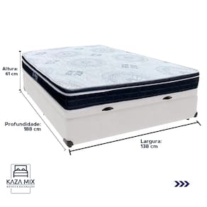 O conforto que sua casa precisa e a qualidade que você merece está na Kazamix!O Colchão Orthosono One Face une conforto firme e durabilidade com espuma D33 de alta qualidade. Com Euro Pillow , oferece uma camada extra de conforto para noites de sono ainda mais relaxantes. O revestimento em poliéster com bordado contínuo proporciona maciez e elegância, enquanto a tecnologia No Turn dispensa a necessidade de virar o colchão. Conta com base antiderrapante para maior estabilidade e tratamento antiácaro e antifungo, garantindo proteção contra alérgenos. Produzido com EPS, contribui para melhor isolamento térmico e maior leveza do produto. Certificado pelo INMETRO e fabricado com materiais sustentáveis, é a escolha ideal para quem busca qualidade e bem-estar.Modelo: Orthosono Marca: AnjosTamanho: CasalDimensões: 138x188X18 (Largura x Comprimento x Altura)Conforto: FirmeSistema: Espuma D33Pillow: Euro Pillow Peso Máximo recomendado: 140 kg (Por pessoa)Proteções: Antiácaro, antialérgico, antifungo, antimofoGarantia: 1 ano pelo FabricanteO conforto que sua casa precisa e a qualidade que você merece está na KazamixAproveite cada metro quadrado do seu dormitório com a Cama Box Baú!Projetada com madeira de reflorestamento reforçada, a Cama Box Baú é a escolha ideal para quem busca otimização de espaço e praticidade na organização do dia a dia.Com um baú generoso, ela oferece a solução perfeita para armazenar travesseiros extras, cobertores, malas e muito mais. Além disso, sua estrutura robusta suporta até 150 kg por pessoa, garantindo a sustentação ideal para o seu colchão e prolongando sua vida útil.O pistão a gás robusto proporciona uma abertura suave e segura do baú, oferecendo praticidade e resistência no uso diário. Para completar, o acabamento de alta qualidade combina perfeitamente com qualquer estilo de decoração, agregando elegância e versatilidade ao seu ambiente.Não perca tempo! Adquira agora mesmo sua Cama Box Baú e diga adeus à falta de espaço e desorganização.Marca: KazaMixModelo: BaúCor do Box: BrancoTamanho: CasalDimensões: 138X188X37 (Largura x Comprimento x Altura) Estrutura: MadeiraPeso máximo recomendado: 150 kg (Por Pessoa)Altura do Box: 32 cm Altura dos Pés: 5 cm Altura total: 37 cm Garantia: 03 mesesSelo Ecologicamente CorretoAtenção: Antes de finalizar sua compra, certifique-se de que as dimensões do produto sejam adequadas para serem transportadas pelos elevadores, portas, escadas e corredores de sua residência. Ressaltamos que não nos responsabilizamos pelo transporte do produto por meios específicos, como escadas, guinchos ou içamentos.