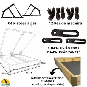 Acompanha: 04 PISTÕES A GÁS - amortecedores pneumáticos que possibilitam a fácil abertura do baú, o mantendo aberto enquanto o utiliza. 02 puxadores utilizados para facilitar a abertura e o fechamento do box baú. 12 pezinhos de madeira - resistentes e ideais para suportar o peso Cantoneiras