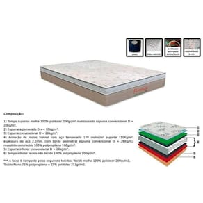 Dimensões(Cm): Comnto(Profundidade): 188cm x Largura: 138cm x Altura: 30cm Vantagens Extras de Colchão - c/ Sistema Polyframe - Manta Acrílica Tipo de Pillow - Pillow Top Europeu Tecido com Tratamento do Colchão - AntiÁcaro e AntiFungo Bordado do Revestimento do Colchão - Matelassê Forração Revestimento do Colchão - Poliéster - Malha de Alta Qualidade Forração do Revestimento Inferior do Colchão - Antiderrapante Tecido de Revestimento da Faixa Lateral do Colchão - Bordado Modo de Utilização do Colchão - One Side Camadas Interna do Estofamento de Espuma do Colchão - Alta Qualidade - AG - D20 Tipo de Mola do Colchão - Bonnel Nível de Firmeza do Colchão - Extra Firme Peso Máximo Suportado do Colchão - 150 kg Certificação de Qualidade do Colchão - Qualidade Aprovada Nossa Avaliação do Colchão - Qualidade Excelente Tempo de Garantia do Colchão - 12 meses