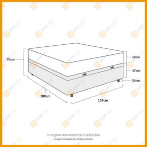 Especificações Técnicas Baú: - Marca: Lucas Home; - Material: Madeira tratada; - Peso máximo recomendado: até 150 Kg (por pessoa); - Altura do baú: 37cm; - Profundidade do baú: 27cm; - Altura dos pés: 5cm; - Revestimento da Cama: Material Sintético; - Garantia: 6 meses de garantia; - Dimensões do produto (largura x comprimento x altura) Casal: 138x188x42cm.