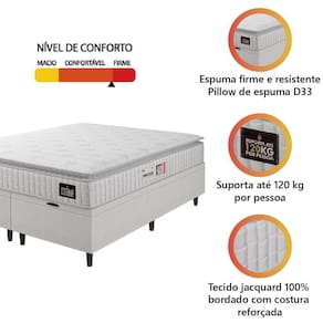 Você merece o melhor quando se trata do seu sono e bem-estar, e por isso o Colchão de Casal Queen Van Gogh e o Box Baú Prince se tornam a escolha perfeita para o seu quarto! O Colchão suporta até 120 kg por pessoa, possui tampo bordado em malha, laterais em tecido Jacquard de toque macio e uma camada de Pillow Top para que você tenha uma noite de sono mais tranquila, com garantia de total descanso e qualidade de vida! O Box é feito de tecido reforçado e nobre, possui baú e um sistema de abertura fácil, onde você terá mais espaço para poder guardar os seus objetos pessoais, roupas, travesseiros, edredons. Confeccionado com materiais de qualidade garantindo maior durabilidade e resistência.