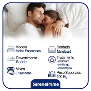 Especificações Técnicas Colchão: Marca: SerenePrime Modelo: Molas Ensacadas Proteções: Antiácaro - Antialérgico Tecido de Revestimento: Bordado Matelassê Forração Revestimento: Malha Importada Dimensões do Colchão (largura x comprimeento x altura) Casal: 138x188x18cm