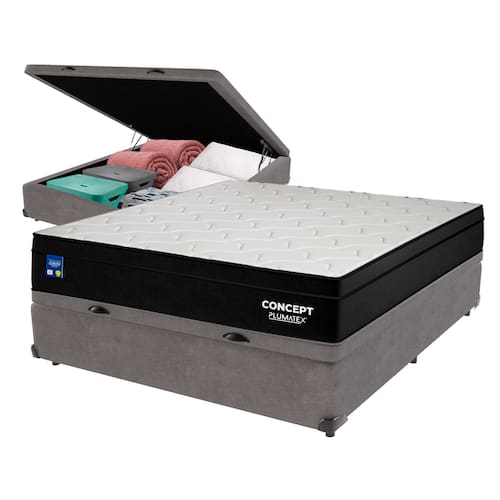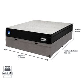 Bem-vindo(a) ao nosso catálogo!Apresentamos a você uma descrição completa sobre esse produto:Fundada em outubro de 1984, a Plumatex se destaca como a mais moderna e bem estruturada empresa do segmento colchoeiro, com cinco fábricas próprias instaladas nos estados de Goiás, Bahia, Paraíba, Rio de Janeiro e Maranhão, e uma fábrica terceirizada em Santa Catarina.Sempre atentos às novas tecnologias, somos especialistas em fabricação e inovação. Produzimos colchões dos sonhos para todos os bolsos, assinados pelas nossas marcas própriasModelo: ConceptNível de Conforto: IntermediárioSuporte de peso: 220 quilos (110 kg por pessoa)Molas: Molas ensacadas individualmentePillow: EuroPillowEspuma: D26Altura: 25 cmTecido: Sarja Winter – 130 g/m² Apresentamos o modelo Concept, uma escolha perfeita para quem busca o equilíbrio ideal entre firmeza e maciez. Com um design minimalista e sofisticado, este colchão combina tecnologia avançada com conforto superior.Equipado com molas ensacadas individualmente, o Concept proporciona um suporte personalizado que se adapta ao seu corpo, enquanto a espuma certificada D26 kg/m³ garante resiliência e um toque suave. O tampo em Sarja Winter oferece conforto térmico e durabilidade, tornando suas noites de sono ainda mais agradáveis.A lateral em Kupon e o pillow INN complementam o design, conferindo um visual moderno e elegante. Com 25 cm de altura, suporte para até 110 kg e detalhes de construção que incluem EPS para estabilidade e TNT 100g para maior aderência, o Concept é a escolha ideal para quem valoriza um descanso confortável e refinado.Descubra o modelo Concept e transforme seu sono em uma experiência de bem-estar incomparável.Além de tudo, esse produto acompanha a Cama Box com Baú da Kaza Mix e assim se torna um conjunto perfeito para o seu quarto!Marca: Kaza MixCor do Baú: CinzaTamanho: CasalMaterial dos pés: MadeiraEstrutura: MadeiraPeso máximo recomendado: Até 150kg de cada ladoAbertura: Pistão a gásLargura: 138cmComprimento: 188cmAltura total: 42cmAltura interna Baú: 27cmAltura dos pés: 6cmGarantia: 03 mesesSelo Ecologicamente CorretoAtenção: - Antes de finalizar sua compra, recomendamos que verifique se as dimensões do produto são adequadas para serem transportadas pelos elevadores, portas, escadas e corredores de sua residência. Ressaltamos que não nos responsabilizamos pelo transporte do produto por meios específicos, como escadas, guinchos ou içamentos.- É possível que hajam leves variações de cor de acordo com o dispositivo que está sendo utilizado como smartphones, computadores, monitores e outros.
