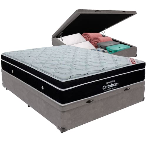 Cama Box Baú Cinza e Colchão Elegant Molas Ensacadas Casal Ortobom