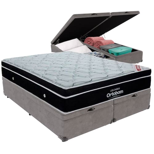 O conforto que sua casa precisa e a qualidade que você merece está na Kazamix!Desfrute do máximo conforto com o Colchão Elegant Ortobom! Sua estrutura de molas ensacadas, combinada com espuma D26 de alta densidade, proporciona o suporte perfeito para uma noite de sono revigorante. O Pillow Euro oferece um toque adicional de suavidade, garantindo um descanso ainda mais relaxante.Com o sistema No Turn, a manutenção se torna super simples, pois não é necessário virar o colchão. A fibra de bambu, que possui um toque macio e aconchegante, também contribui para um ambiente mais sustentável e confortável.Experimente o Colchão Elegant Ortobom e descubra o conforto, a qualidade e a inovação que você merece. Invista em noites de sono incríveis!Modelo: ElegantMarca: OrtobomTamanho: KingDimensões: 193x203X28 (Largura x Comprimento x Altura)Conforto: FirmeSistema: Molas EnsacadasPillow: Euro PillowPeso Máximo recomendado: 150 kg (Por pessoa)Proteções: Antiácaro, antialérgico, antifungo, antimofoGarantia: 1 ano pelo FabricanteO conforto que sua casa precisa e a qualidade que você merece está na KazamixAproveite cada metro quadrado do seu dormitório com a Cama Box Baú!Projetada com madeira de reflorestamento reforçada, a Cama Box Baú é a escolha ideal para quem busca otimização de espaço e praticidade na organização do dia a dia.Com um baú generoso, ela oferece a solução perfeita para armazenar travesseiros extras, cobertores, malas e muito mais. Além disso, sua estrutura robusta suporta até 150 kg por pessoa, garantindo a sustentação ideal para o seu colchão e prolongando sua vida útil.O pistão a gás robusto proporciona uma abertura suave e segura do baú, oferecendo praticidade e resistência no uso diário. Para completar, o acabamento de alta qualidade combina perfeitamente com qualquer estilo de decoração, agregando elegância e versatilidade ao seu ambiente.Não perca tempo! Adquira agora mesmo sua Cama Box Baú e diga adeus à falta de espaço e desorganização.Marca: KazaMixModelo: BaúCor do Box: CinzaTamanho: KingDimensões: 193X203X37 (Largura x Comprimento x Altura) Estrutura: MadeiraPeso máximo recomendado: 150 kg (Por Pessoa)Altura do Box: 32 cm Altura dos Pés: 5 cm Altura total: 37 cm Garantia: 03 mesesSelo Ecologicamente CorretoAtenção: Antes de finalizar sua compra, certifique-se de que as dimensões do produto sejam adequadas para serem transportadas pelos elevadores, portas, escadas e corredores de sua residência. Ressaltamos que não nos responsabilizamos pelo transporte do produto por meios específicos, como escadas, guinchos ou içamentos.