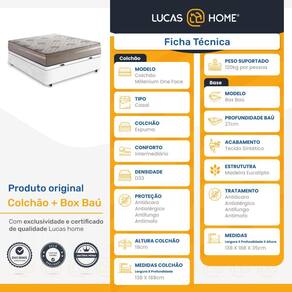 Produzido com materiais de qualidade, sua estrutura é composta por uma placa reforçada de poliestireno expandido, suporta até 120Kg (por pessoa), o que garante uma sustentação extra, o colchão Millenium One Face D33 possui 19cm de altura e o seu acabamento em espuma D33 e tecido Jacquard, é uma oitma opção para quem não renuncia à saúde, conforto e um belo design, o mais legal que ele é ortopédico, o que garante a posição correta para sua coluna durante o seu sono. A base baú é confeccionada com madeira de reflorestamento com tratamentos anticupim e antimofo, o seu diferencial é o compartimento interno garantindo um novo espaço em seu quarto, agregando um valor e sofisticação ao ambiente.