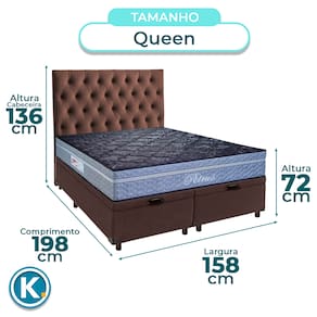 Conjunto Queen Colchão Petrus + Cama Box BauColchão Queen com 30cm de altura, ideal para quem busca conforto e robustezRevestimento em poliéster resistente, com toque macio e acabamento modernoSuporta até 150kg, oferecendo alta durabilidade e firmeza para diferentes biotiposBase baú Queen com 42cm de altura e amplo espaço interno para organizaçãoRevestimento em Veludo , fácil de limpar e com visual modernoEstrutura reforçada com capacidade para até 150KgFicha Técnica Colchão:Modelo: PetrusMarca: ParopasTamanho: QueenTecido: PoliésterLargura: 158cmComprimento: 198cmAltura: 30cmSuporte de Peso: 150KgGarantia: 3 MesesFicha Técnica Cama Box Bau:Modelo: EliteMarca: NatureTamanho: QueenTecido: VeludoLargura: 158cmComprimento: 198cmAltura: 35cmAltura dos Pés: 7cmMaterial dos Pés: MadeiraSuporte de Peso: 150KgPeso: 40KgGarantia: 3 MesesAtenção:Antes da compra certifique-se de que o produto passa por elevadores, portas e corredores.As transportadoras não realizam entregas por escadas ou içamentos.Caso o item não caiba no elevador, a entrega será considerada concluída no térreo do prédio.A cor e tonalidade do produto pode variar de acordo com o dispositivo que o usuário está acessando.