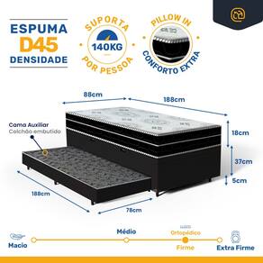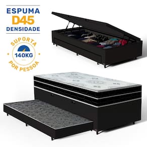 Madeira tratada (base baú), Espuma D45 (colchão), Espuma D20 (cama auxiliar), Material Sintético (revestimento)Vendido e entregue por Lucas Colchões