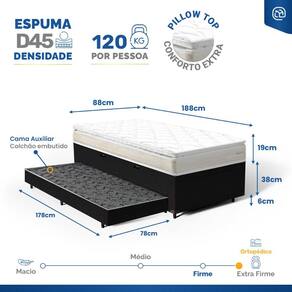 Cama Box Baú com Colchão de Espuma D45 Pillow Top Ortopédico Domo + Auxiliar Solteiro 88cm - Preto