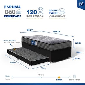 - Dimensões do produto (larg. x comp. x alt.) Solteiro: 88x188x44cm.