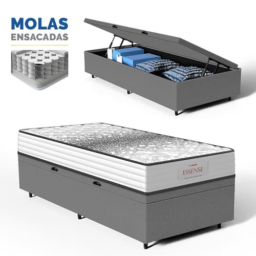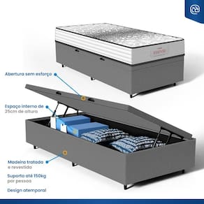 Além do colchão, a base baú incorporada aumenta a funcionalidade do seu quarto, oferecendo um espaço de armazenamento adicional. Construída com madeira tratada, tornando-a não apenas prática mas também durável e resistente. Este conjunto é a solução perfeita para quem busca maximizar o conforto e a utilidade em espaços compactos.