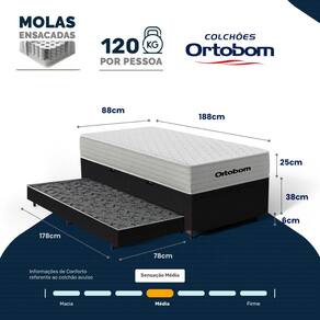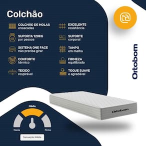 Especificações Técnicas Colchão: - Marca: Ortobom; - Exclusivo Lucas Home; - Tipo: Molas Ensacadas; - Tipo de conforto: Intermediário (Equilíbrio perfeito); - Proteções: Antiácaro, Antialérgico, Antifungo, Antimofo; - Tampo: Malha (Conforto Térmico); - Sistema One Face: Tecnologia No Turn(Dispensa a necessidade de girar); - EPS Poliestireno Expansível(Suporte adicional): Possuí; - Peso máximo recomendado: até 120kg (por pessoa); - Garantia: 12 Meses;- Dimensões (larg. x comp. x alt.) 88x188x25cm.