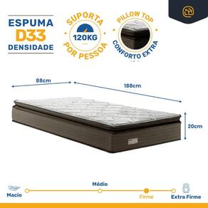 Buscando um colchão que combine conforto ortopédico com proteção completa contra alérgenos? Nosso colchão, com densidade de espuma D33 e pillow top, oferece um suporte firme ideal para quem precisa cuidar da postura durante o sono. A camada extra de conforto proporcionada pelo pillow top garante uma superfície mais acolhedora, enquanto suporta até 120kg por pessoa, adequando-se perfeitamente às suas necessidades de descanso.Além disso, as características do revestimento, tanto no tampo quanto nas laterais, são feitas de malha e malha 3D, que promovem uma melhor ventilação e aumentam a durabilidade do colchão.