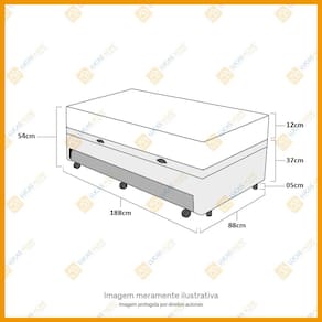 Especificações Técnicas Baú: - Marca: Lucas Home; - Material: Madeira tratada; - Peso máximo recomendado: até 150 Kg (por pessoa); - Altura do baú: 37cm; - Profundidade do baú: 15cm; - Altura dos pés: 5cm; - Revestimento da Cama: Material Sintético; - Revestimento da Auxiliar: Poliéster; - Garantia: 12 meses de garantia; - Dimensões do produto (largura x comprimento x altura) 88x188x42cm.