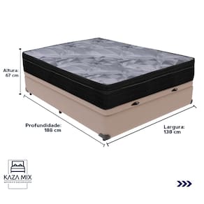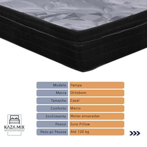 O conforto que sua casa precisa e a qualidade que você merece está na Kazamix! Redefina suas noites de sono com o Colchão Pampa Molas Ensacadas, projetado para oferecer máximo conforto e suporte. Suas molas ensacadas individualmente garantem estabilidade, minimizando vibrações e proporcionando um descanso tranquilo. O Ortopillow com tecido em poliéster de alta resistência e bordado matelassê acrescenta uma camada extra de maciez e conforto. Com tratamento antiácaro, antifungo e tecnologia No Turn, é ideal para quem busca praticidade e um ambiente de sono mais saudável. Este colchão combina qualidade e durabilidade para oferecer uma experiência de descanso incomparável. Modelo: Pampa Marca: Ortobom Tamanho: Casal Dimensões: 138x188X24 (Largura x Comprimento x Altura) Conforto: Macio Sistema: Molas ensacadas Pillow: Euro Pillow Peso Máximo recomendado: 120 kg (Por pessoa) Proteções: Antiácaro, antialérgico, antifungo, antimofo Garantia: 1 ano pelo FabricanteO conforto que sua casa precisa e a qualidade que você merece está na Kazamix Aproveite cada metro quadrado do seu dormitório com a Cama Box Baú! Projetada com madeira de reflorestamento reforçada, a Cama Box Baú é a escolha ideal para quem busca otimização de espaço e praticidade na organização do dia a dia. Com um baú generoso, ela oferece a solução perfeita para armazenar travesseiros extras, cobertores, malas e muito mais. Além disso, sua estrutura robusta suporta até 150 kg por pessoa, garantindo a sustentação ideal para o seu colchão e prolongando sua vida útil. O pistão a gás robusto proporciona uma abertura suave e segura do baú, oferecendo praticidade e resistência no uso diário. Para completar, o acabamento de alta qualidade combina perfeitamente com qualquer estilo de decoração, agregando elegância e versatilidade ao seu ambiente. Não perca tempo! Adquira agora mesmo sua Cama Box Baú e diga adeus à falta de espaço e desorganização. Marca: KazaMix Modelo: Baú Tamanho: Casal Dimensões: 138X188X37 (Largura x Comprimento x Altura) Estrutura: Madeira Peso máximo recomendado: 150 kg (Por Pessoa) Altura do Box: 32 cm Altura dos Pés: 5 cm Altura total: 37 cm Garantia: 03 meses Selo Ecologicamente Correto Atenção: Antes de finalizar sua compra, certifique-se de que as dimensões do produto sejam adequadas para serem transportadas pelos elevadores, portas, escadas e corredores de sua residência. Ressaltamos que não nos responsabilizamos pelo transporte do produto por meios específicos, como escadas, guinchos ou içamentos.