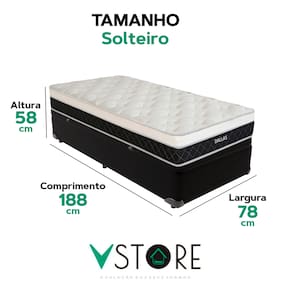 A tecnologia que a sua casa merece está na V-Store! O Conjunto Colchão Dallas e Base Box Baú Bravus combina conforto e praticidade. O colchão, com molas ensacadas, espuma D33, Euro Pillow e tecnologia EPS, oferece suporte ideal, conforto térmico, maior durabilidade e resistência. A base box baú, com estrutura reforçada e acabamento elegante, proporciona amplo espaço para armazenamento e organização do dormitório. Perfeito para quem busca qualidade, funcionalidade e sofisticação. Adquira agora e transforme suas noites de sono! Característica Do Colchão: Modelo: DallasMarca: V-StoreTamanho: SolteiroDimensões: 78x20x188 (Largura x Altura x Comprimento)Conforto: MédioSistema: Molas EnsacadasPillow: Euro PillowPeso Máximo recomendado: 150 kg (Por pessoa)Proteções: Antiácaro, antialérgico, antifungo, antimofoGarantia: 12 Meses (Espuma) / 10 anos ( Conjunto de Molas Ensacadas)Característica Da Base: Marca: V-StoreModelo: BravusTamanho: SolteiroDimensões: 78x44x188 (Largura x Altura x Comprimento)Estrutura: MadeiraPeso máximo recomendado: 150 kg (Por Pessoa)Altura do Box: 38 cmAltura dos Pés: 6 cmAltura total: 44 cmGarantia: 12 Meses (Estrutura) / 3 meses (Tecido)Selo Ecologicamente CorretoAtenção:- Antes de finalizar sua compra, recomendamos que verifique se as dimensões do produto são adequadas para serem transportadas pelos elevadores, portas, escadas e corredores de sua residência. Ressaltamos que não nos responsabilizamos pelo transporte do produto por meios específicos, como escadas, guinchos ou içamentos.- É possível que hajam leves variações de cor de acordo com o dispositivo que está sendo utilizado como smartphones, computadores, monitores e outros.