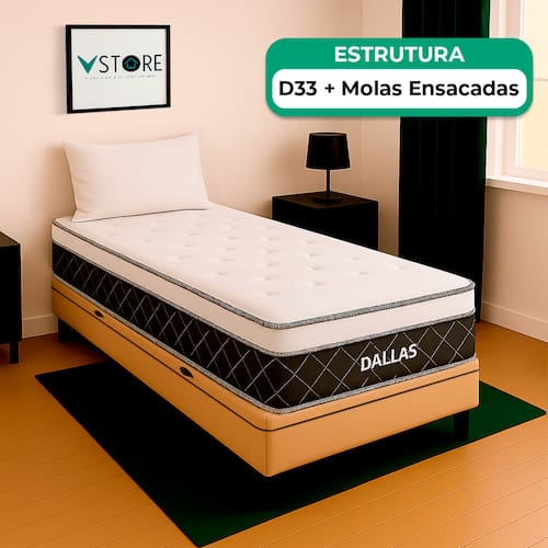 A tecnologia que a sua casa merece está na V-Store! O Conjunto Colchão Dallas e Base Box Baú Bravus combina conforto e praticidade. O colchão, com molas ensacadas, espuma D33, Euro Pillow e tecnologia EPS, oferece suporte ideal, conforto térmico, maior durabilidade e resistência. A base box baú, com estrutura reforçada e acabamento elegante, proporciona amplo espaço para armazenamento e organização do dormitório. Perfeito para quem busca qualidade, funcionalidade e sofisticação. Adquira agora e transforme suas noites de sono! Característica Do Colchão: Modelo: DallasMarca: V-StoreTamanho: SolteiroDimensões: 78x20x188 (Largura x Altura x Comprimento)Conforto: MédioSistema: Molas EnsacadasPillow: Euro PillowPeso Máximo recomendado: 150 kg (Por pessoa)Proteções: Antiácaro, antialérgico, antifungo, antimofoGarantia: 12 Meses (Espuma) / 10 anos ( Conjunto de Molas Ensacadas)Característica Da Base: Marca: V-StoreModelo: BravusTamanho: SolteiroDimensões: 78x44x188 (Largura x Altura x Comprimento)Estrutura: MadeiraPeso máximo recomendado: 150 kg (Por Pessoa)Altura do Box: 38 cmAltura dos Pés: 6 cmAltura total: 44 cmGarantia: 12 Meses (Estrutura) / 3 meses (Tecido)Selo Ecologicamente CorretoAtenção:- Antes de finalizar sua compra, recomendamos que verifique se as dimensões do produto são adequadas para serem transportadas pelos elevadores, portas, escadas e corredores de sua residência. Ressaltamos que não nos responsabilizamos pelo transporte do produto por meios específicos, como escadas, guinchos ou içamentos.- É possível que hajam leves variações de cor de acordo com o dispositivo que está sendo utilizado como smartphones, computadores, monitores e outros.