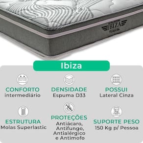 O colchão Ibiza combina Molas Ensacadas, espuma de alta performance e sistema EPS, oferecendo suporte, conforto térmico e design moderno para noites revigorantes. Já a Base Box Baú Bravus une funcionalidade e elegância, com estrutura resistente, revestimento em tecido sintético e amplo espaço para armazenamento, ideal para otimizar o quarto com estilo..