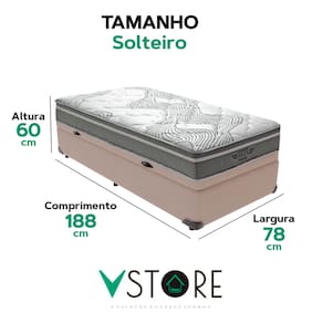 A tecnologia que a sua casa merece está na V-Store! O colchão Ibiza combina Molas Ensacadas, espuma de alta performance e sistema EPS, oferecendo suporte, conforto térmico e design moderno para noites revigorantes. Já a Base Box Baú Bravus une funcionalidade e elegância, com estrutura resistente, revestimento em tecido sintético e amplo espaço para armazenamento, ideal para otimizar o quarto com estilo..Característica Do Colchão: Modelo: IbizaMarca: V-StoreTamanho: SolteiroDimensões: 78x22x188 (Largura x Altura x Comprimento)Conforto: intermediárioSistema: Molas EnsacadasPillow: Não se aplicaPeso Máximo recomendado: 150 kg (Por pessoa)Proteções: Antiácaro, antialérgico, antifungo, antimofoGarantia: 12 Meses (Espuma) / 10 anos ( Conjunto de Molas Ensacadas)Característica Da Base: Marca: V-StoreModelo: BravusTamanho: SolteiroDimensões: 78x44x188 (Largura x Altura x Comprimento)Estrutura: MadeiraPeso máximo recomendado: 150 kg (Por Pessoa)Altura do Box: 38 cmAltura dos Pés: 6 cmAltura total: 44 cmGarantia: 12 Meses (Estrutura) / 3 meses (Tecido)Selo Ecologicamente CorretoAtenção:- Antes de finalizar sua compra, recomendamos que verifique se as dimensões do produto são adequadas para serem transportadas pelos elevadores, portas, escadas e corredores de sua residência. Ressaltamos que não nos responsabilizamos pelo transporte do produto por meios específicos, como escadas, guinchos ou içamentos.- É possível que hajam leves variações de cor de acordo com o dispositivo que está sendo utilizado como smartphones, computadores, monitores e outros.