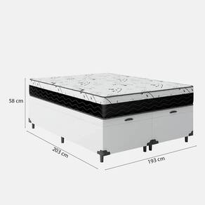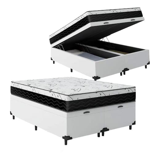 Cama Box Baú King 193 Bipartido com Colchão Espuma D33 One Face PretoO colchão One Face é compostos por poliestireno expandido ( EPS) que juntamente com a espuma de Densidade D33 são responsáveis por toda a sustentação do peso. Eles são indicados para aqueles que sentem dores nas costas em relação aos outros tipos de colchões no Mercado. Famoso pela durabilidade, também suportam mais pesos e são recomendadas para aqueles que procuram um colchão com mais firmeza. Já a cama baú é uma ótima opção para quem busca praticidade e economia de espaço, podendo guardar cobertores, jogos de cama, travesseiros. São duas camas de 96cm cada que juntas foram uma cama da casal de 193cm de largura.Informações do Colchão: 1. Tecido de revestimento: Poliéster Bordado; 2. Cor: Branco c/ Preto; 3. Modelo: One Face (uma face); 4. Tamanho: Altura: 17 cm, Largura: 193 cm, Comprimento: 203 cm. 5. Peso limite: 120 kg por pessoa. 6. Peso do produto: 4,6 kg 7. Material de estrutura: Espuma D33 e EPS. 8. Tipo de conforto: Intermediário Firme. 9. Garantia: 3 meses. 10. Marca: Bello Box.Especificações Técnicas Baú:- Material: Madeira tratada. - Proteções: Antiácaro - Antialérgico - Antifungo – Antimofo. - Peso máximo recomendado: até 100kg (por pessoa). - Altura do baú: 41cm (35cm c/ 6cm dos pés).- Revestimento: Tecido Sintético.- Cor: Branco.- Marca: Bello Box.- Quantidade de Pés: 12 pés.- Material dos pés: plástico.- Garantia: 3 meses. - Dimensões do produto (altura x largura x comprimento) King: 41x193x203cm. Importante:- As imagens ambientadas são meramente ilustrativas e podem apresentar itens que não compõe o produto;- As cores do produto podem variar de acordo com o monitor, a iluminação do ambiente ou sua percepção visual;- Não nos responsabilizamos em subir pelas escadas ou içar o produto.- Montagens, desmontagens e instalações são responsabilidades do cliente. Estes serviços não estão inclusos no valor do produto. Para evitar imprevistos na sua entrega, confira as dimensões do produto no momento da compra e certifique-se de que ele passará por elevadores, portas, escadas e corredores.