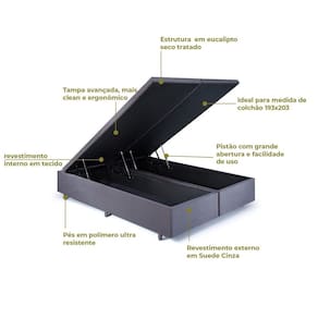Não é recomendado abrir e fechar o baú sem o colchão sobre o mesmo, isso acarretara no mau funcionamento do Baú Acompanha Cama Auxiliar: Não Ambiente Principal: Quarto Cantoneiras: Não Cor: Cinza Cor do Produto: Cinza Itens Inclusos: 1 Cama Baú King size, Manual de montagem e Kit de ferragens Material da Estrutura: Eucalipto Material dos Pés: Plástico Necessita Montagem: Sim Origem do Produto: Nacional Peso: 45 Possui Baú: Sim Recomendações de Uso, Manutenção e Limpeza: só precisa fazer a fixação dos pés. É recomendado fazer a limpeza da base apenas com pano umedecido. Revestimento da Base Box: Suede Tamanho: King Marca: B&G