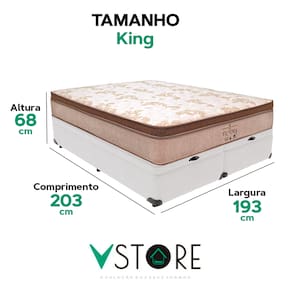 A tecnologia que a sua casa merece está na V-Store! O colchão Victory Solteiro da V-Store oferece noites de sono tranquilas e confortáveis, com seu toque macio e sistema de molas ensacadas que garantem suporte ideal e independência de movimentos. O Pillow Euro Pillow proporciona ainda mais suavidade, enquanto a tecnologia EPS adiciona resistência e durabilidade. Com proteções contra ácaros, fungos, mofo e alergias, ele garante um ambiente de sono saudável. Suporta até 150 kg por pessoa e tem garantia de 12 meses.A Base Box Baú Bravus da V-Store combina praticidade e sofisticação, com madeira reflorestada e revestimento sintético que facilitam a manutenção. Seu design otimiza o espaço de armazenamento e oferece resistência, suportando até 150 kg por pessoa. Com 44 cm de altura total e Selo Ecologicamente Correto, ela é ideal para quem busca sustentabilidade e qualidade. Transforme seu quarto com o colchão Victory e a Base Box Baú Bravus da V-Store!Característica Do Colchão: Modelo: VictoryMarca: V-StoreTamanho: KingDimensões: 193x30x203 (Largura x Altura x Comprimento)Conforto: MédioSistema: Molas EnsacadasPillow: Euro PillowPeso Máximo recomendado: 150 kg (Por pessoa)Proteções: Antiácaro, antialérgico, antifungo, antimofoGarantia: 12 Meses (Espuma) / 10 anos ( Conjunto de Molas Ensacadas)Característica Da Base: Marca: V-StoreModelo: BravusTamanho: KingDimensões: 193x44x203 (Largura x Altura x Comprimento)Estrutura: MadeiraPeso máximo recomendado: 150 kg (Por Pessoa)Altura do Box: 38 cmAltura dos Pés: 6 cmAltura total: 44 cmGarantia: 12 Meses (Estrutura) / 3 meses (Tecido)Selo Ecologicamente CorretoAtenção:- Antes de finalizar sua compra, recomendamos que verifique se as dimensões do produto são adequadas para serem transportadas pelos elevadores, portas, escadas e corredores de sua residência. Ressaltamos que não nos responsabilizamos pelo transporte do produto por meios específicos, como escadas, guinchos ou içamentos.- É possível que hajam leves variações de cor de acordo com o dispositivo que está sendo utilizado como smartphones, computadores, monitores e outros.