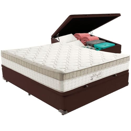 Com um baú generoso, ela oferece a solução perfeita para armazenar travesseiros extras, cobertores, malas e muito mais. Além disso, sua estrutura robusta suporta até 150 kg por pessoa, garantindo a sustentação ideal para o seu colchão e prolongando sua vida útil.