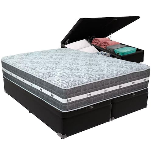 Com um baú generoso, ela oferece a solução perfeita para armazenar travesseiros extras, cobertores, malas e muito mais. Além disso, sua estrutura robusta suporta até 150 kg por pessoa, garantindo a sustentação ideal para o seu colchão e prolongando sua vida útil.