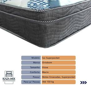 Colchão: Modelo: ISO Superpocket; Marca: Ortobom; Tamanho: Viúvo; Dimensões: 128x188x18cm; (largura x comprimento x altura) Conforto: Espuma D26 e Pillow Euro; Proteções: Antiácaro, antialérgico, antifungo, antimofo; Possui: Sistema No Turn; Peso máximo recomendado: até 100Kg (por pessoa); Garantia: 03 meses;
